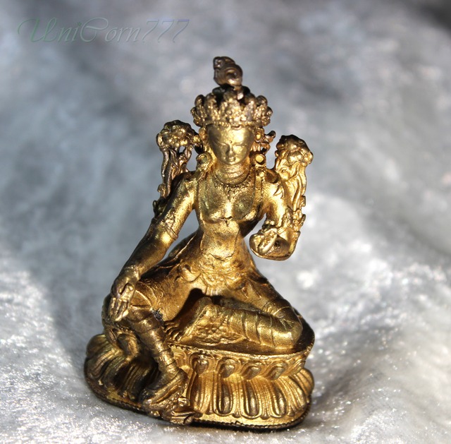 お店のTOPページはこちらです(↓) https://unicorn777.thebase.in/ この菩薩像の材質は真鍮です。 <菩薩について> 菩薩という言葉は、サンスリット語のボーディ・サットヴァを音の通りに漢字に訳した「菩提薩タ(ぼだいさった)」を簡略化した言葉です。 「如来」が、真理を得て悟りを開いた存在であるのに対し、菩薩は、如来になる為に修行をしている存在です。修行をしながら、人々に寄り添い、福徳をもたらしてくださる仏様の事を指します。かつては「菩薩」とは、仏陀を目指す釈迦のことのみを示していたのですが、大乗仏教からは菩薩の概念が広げられて、菩提を目指す全ての者が全て菩薩とされ、それ以降多くの菩薩が誕生しました。 悟りを開く前の釈迦の姿がモデルとされていて、出家前の釈迦がインド王子だった頃を表わしているためか、貴族のようにきらびやかな装飾を身につけているのが特徴です。例えば、「条帛(じょうはく)」というタスキがけした細い帯状の布や、「天衣(てんね)」という肩から胸側に垂らしている白い帯状の布などの優美な服をまとい、長い髪を美しく結い上げて宝冠をかぶっています。また「瓔珞(ようらく)」というネックレスや「腕釧(わんせん)」というブレスレットなどの装身具で飾り立てていたりします。 「菩薩」は仏教界の序列において如来のすぐ下の位にあり、如来の意志に従ってさまざまな姿に変わります。そのため女性のような姿をしていたり、頭上に顔がたくさんあったり、手が千本あったりと、多様な外観をもつのが大きな特徴です。単体でも崇拝されますが、「釈迦三尊」「阿弥陀三尊」のように、如来像の左右に脇侍仏(わきじぶつ)として配置されることもあるようです。 ところで、「菩薩的な生き方」とは、「自分の幸せと他者の幸せを重ねて行動する生き方」の事を指します。現代社会に欠けている側面を、菩薩像を見ながら考えてみるのも良いかもしれませんね。