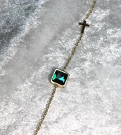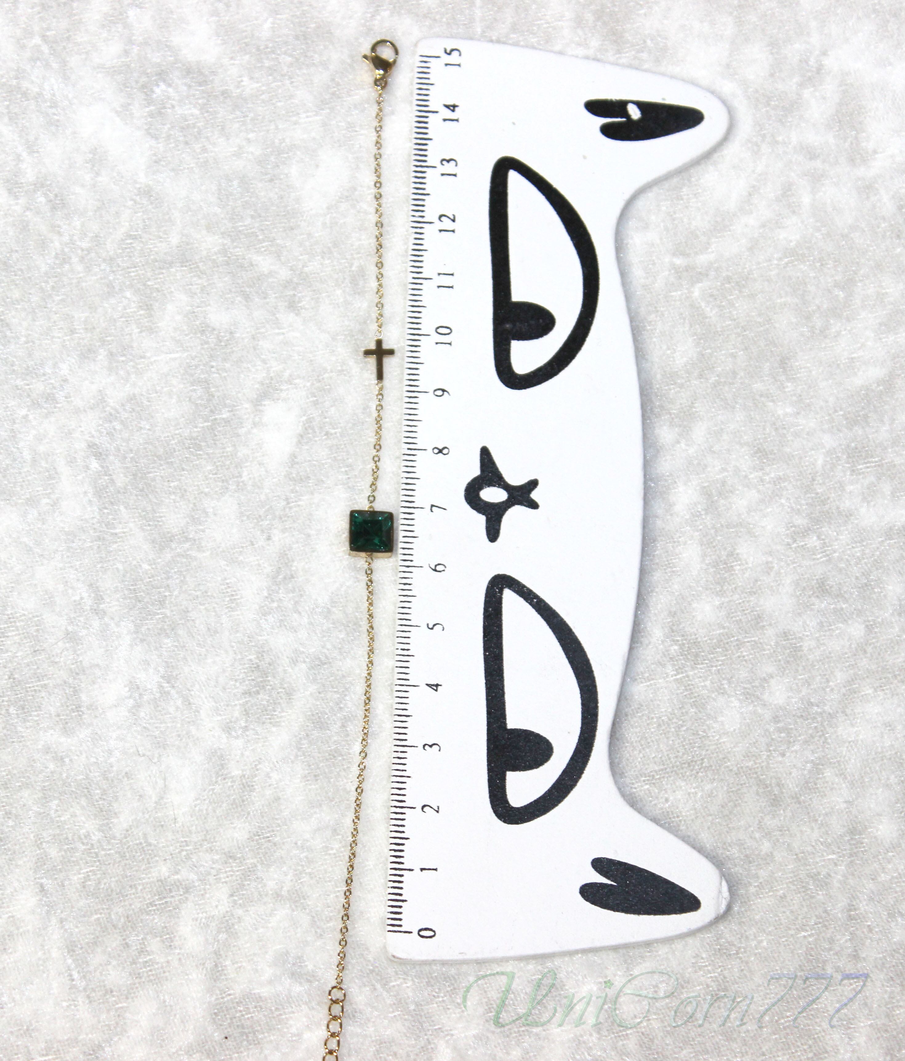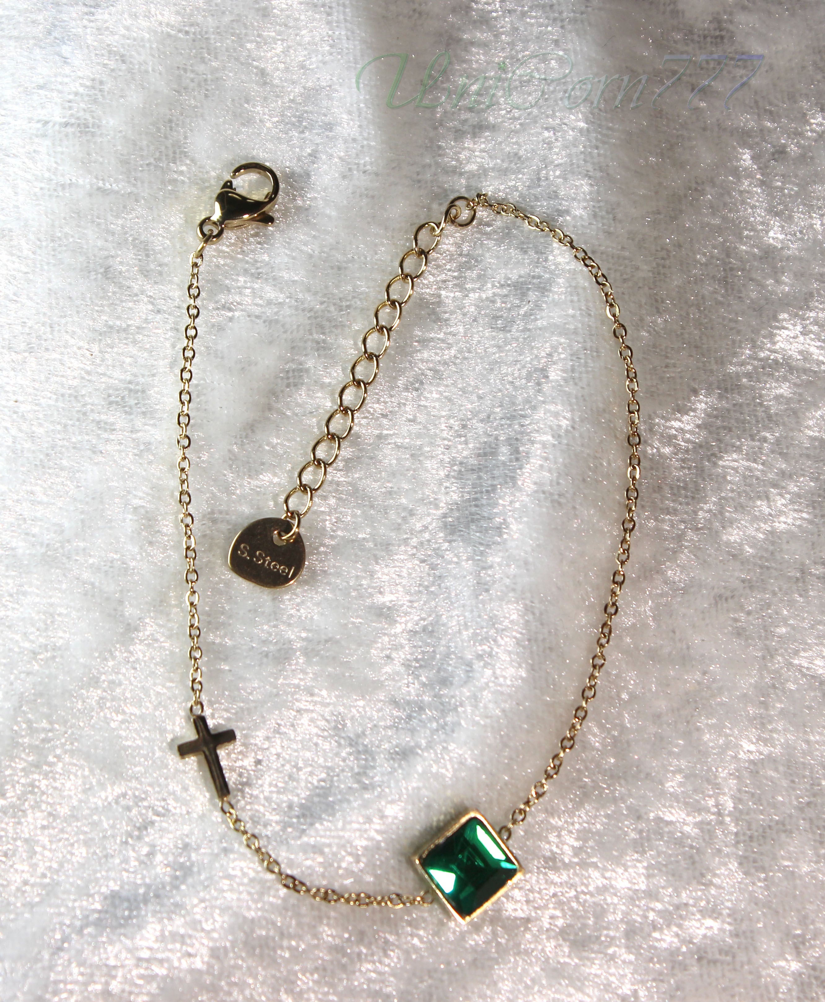 フォレストグリーンの石とクロスを組み合わせたブレスレットです。長さは、15cm+アジャスター4cmです。