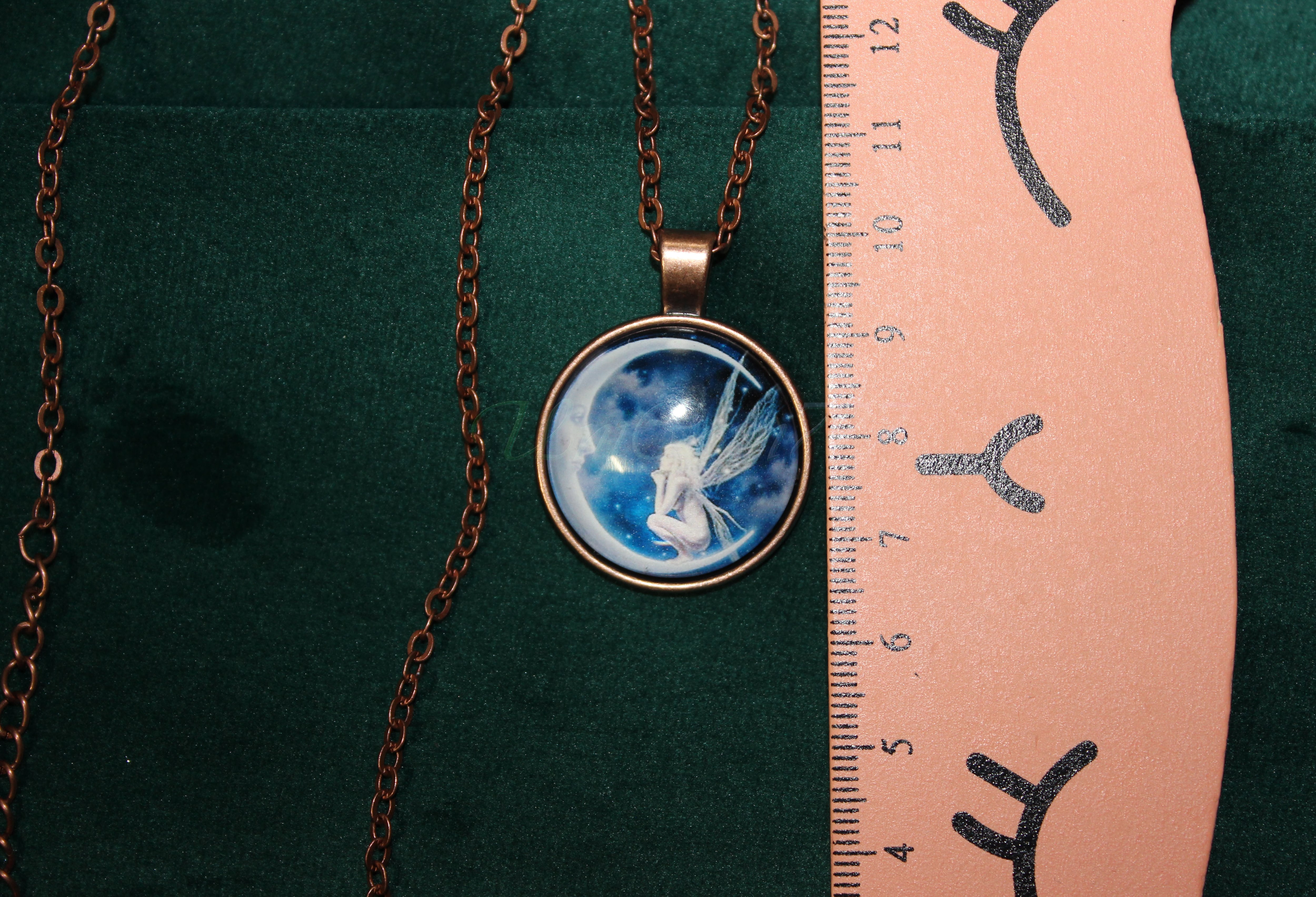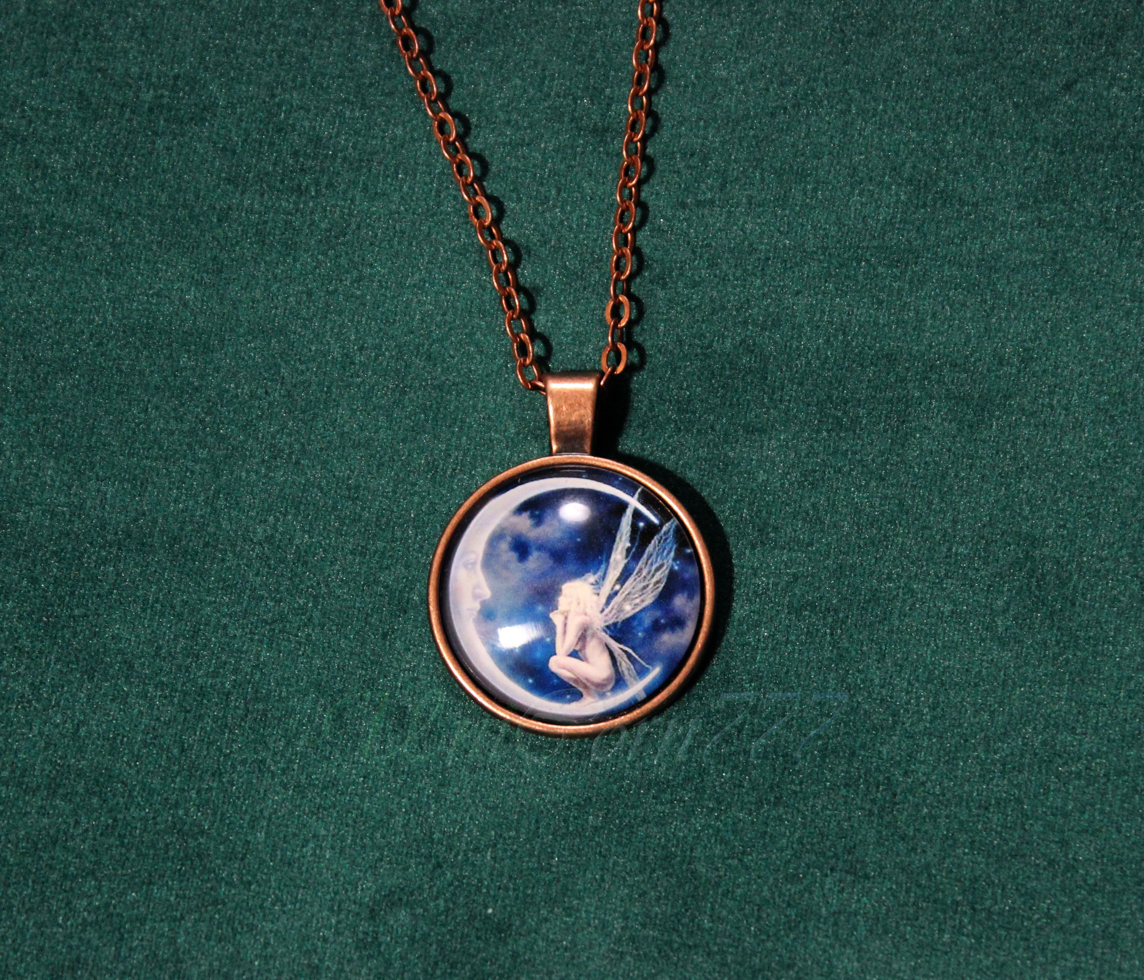 フェアリーがクレセントムーンを熱い視線で見つめている構図のネックレスです。チェーンはブロンズ色で、長さは、57cmです。