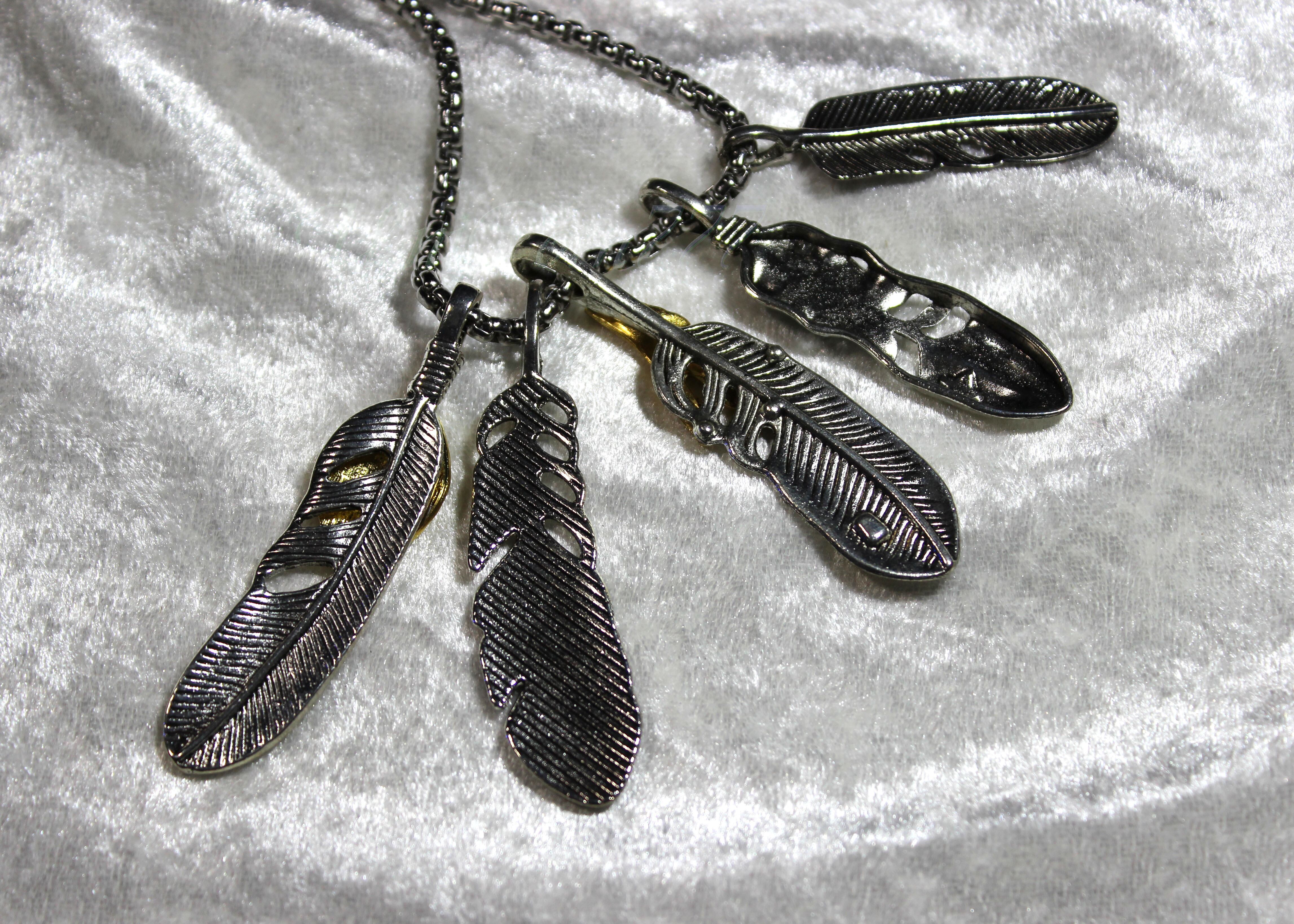 5つの羽根のフェザーネックレスです。チェーンの長さは、60cm、70cm、80cmから選択可能です。5つの羽根を3枚にしたり、1枚で身に着けたり、使い方は自由です。