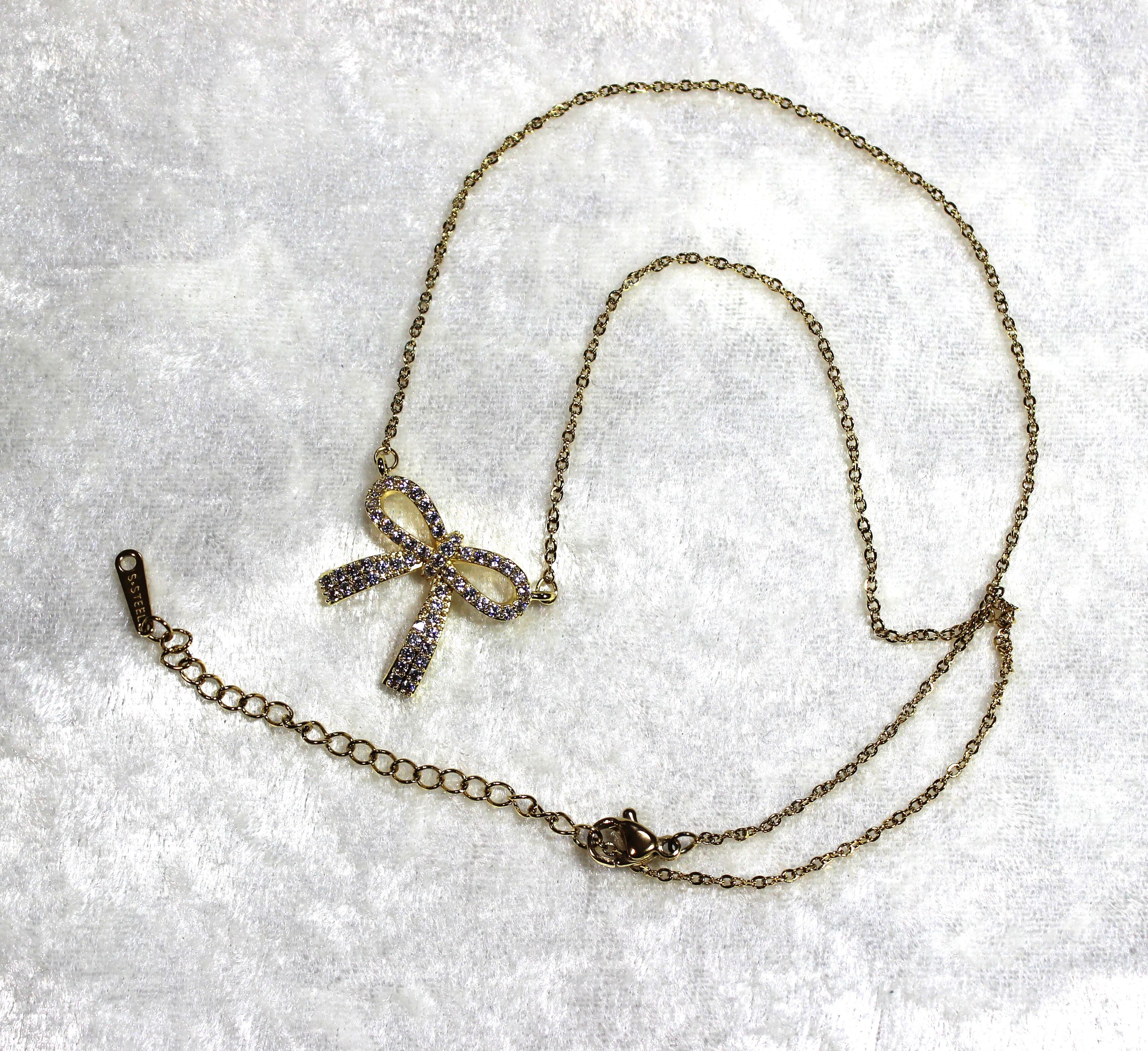 リボンの形をしたネックレスです。金属アレルギーに強い合金の材質です。チェーンは40cm+アジャスター5cmです。