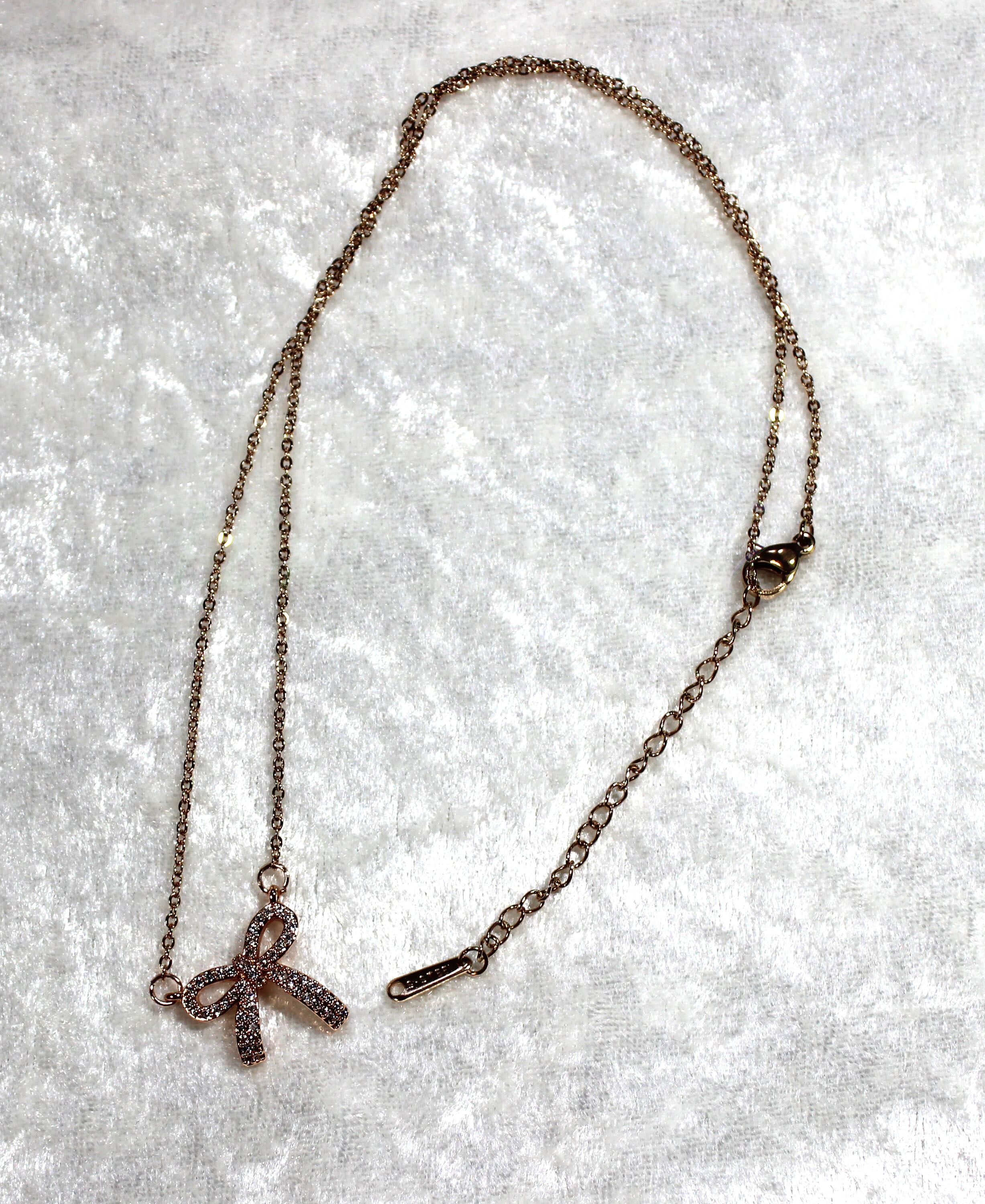 リボンの形をしたネックレスです。チェーンは38cm+アジャスター6cmです。色はピンクゴールドです。材質は、金属アレルギーに強いサージカルステンレス(医療用合金)+真空メッキです。似たような商品を複数出してますが、生産元が違うので微妙に形や色が違うんですね。