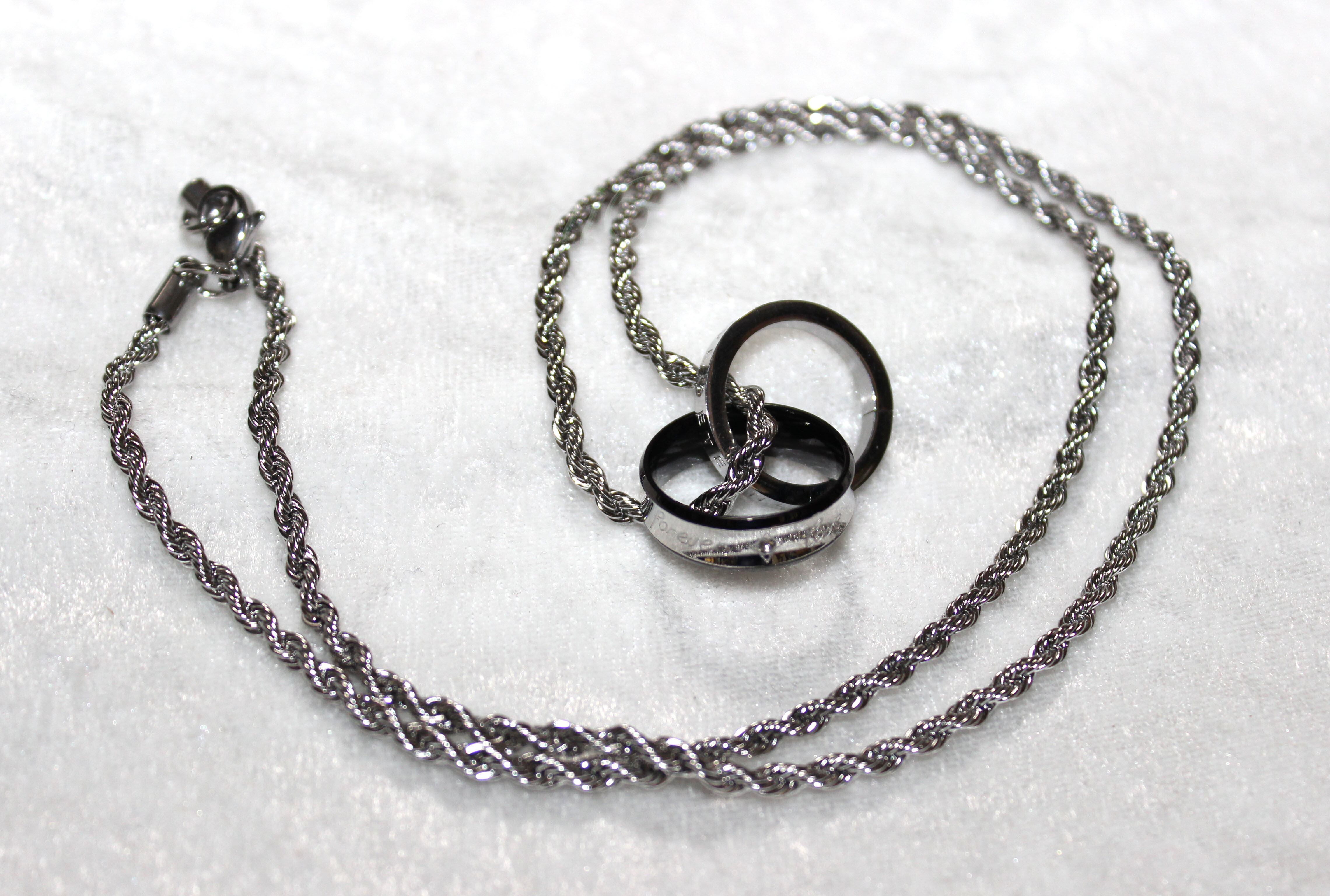 アレルギー体質の方に最適な、チタン鋼の材質で作られたネックレスです。リングの外径は22mm、チェーンは麻縄タイプで、60cmです。リングとチェーンの魅力の両方を楽しめるネックレスとなっております。