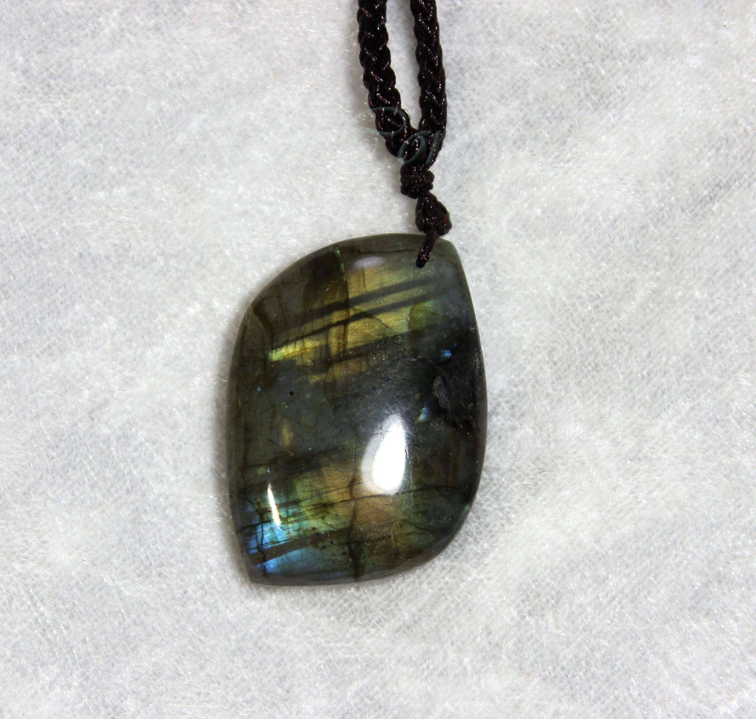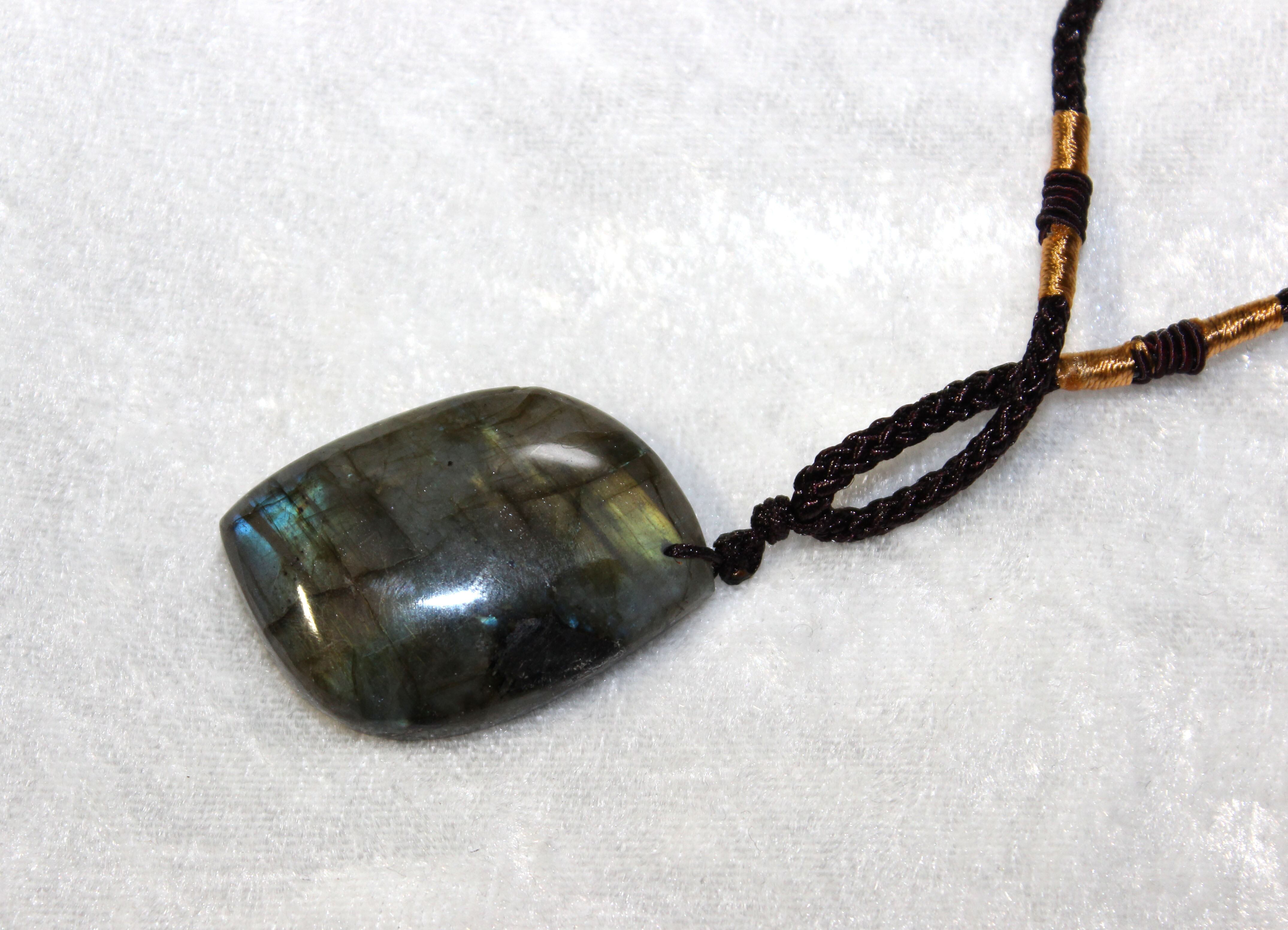 通常の状態だと、ただの石に見えますが、強い光を当てると輝きます。月光石の原石を使用したペンダント・ネックレスです。紐は62cm程度ですが可変長となっております。