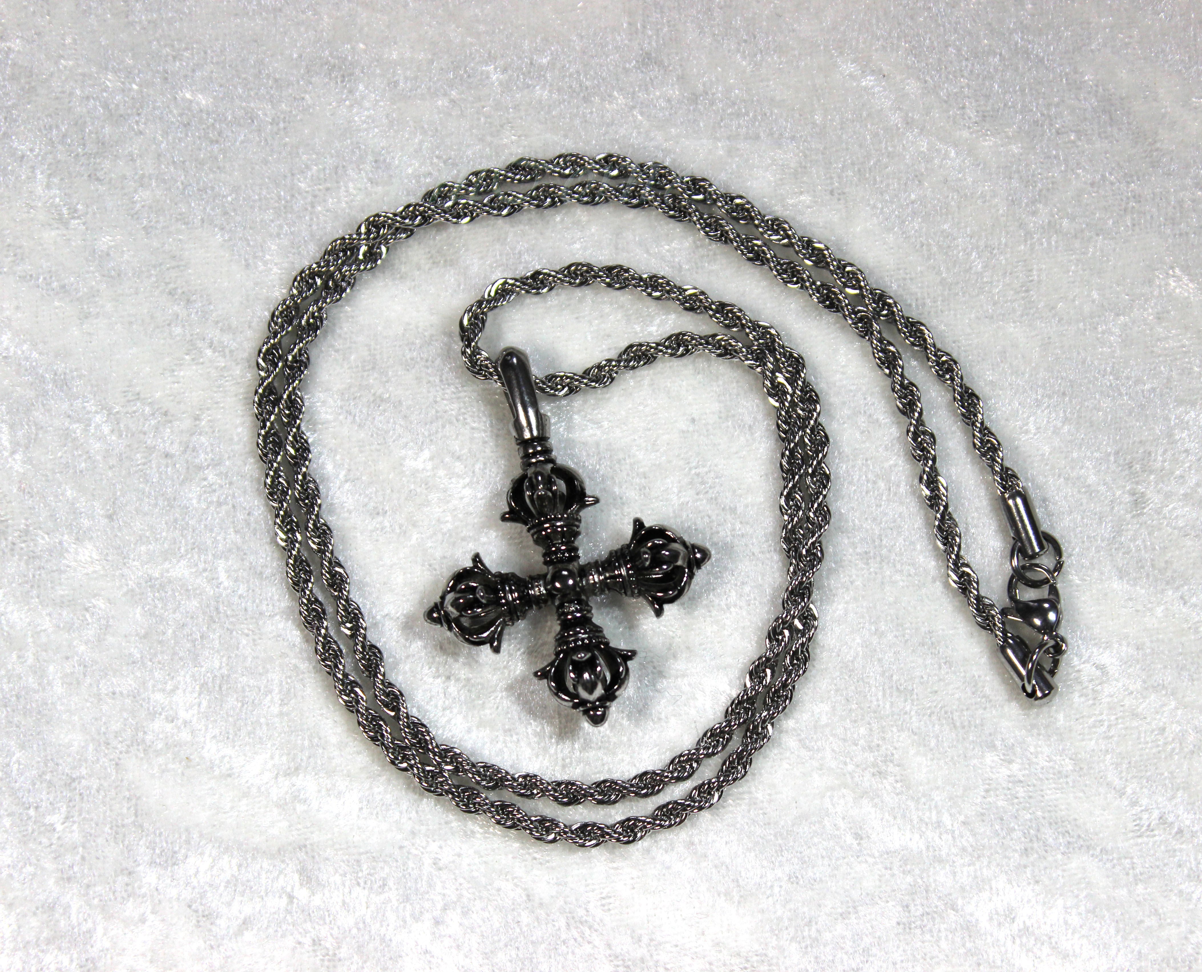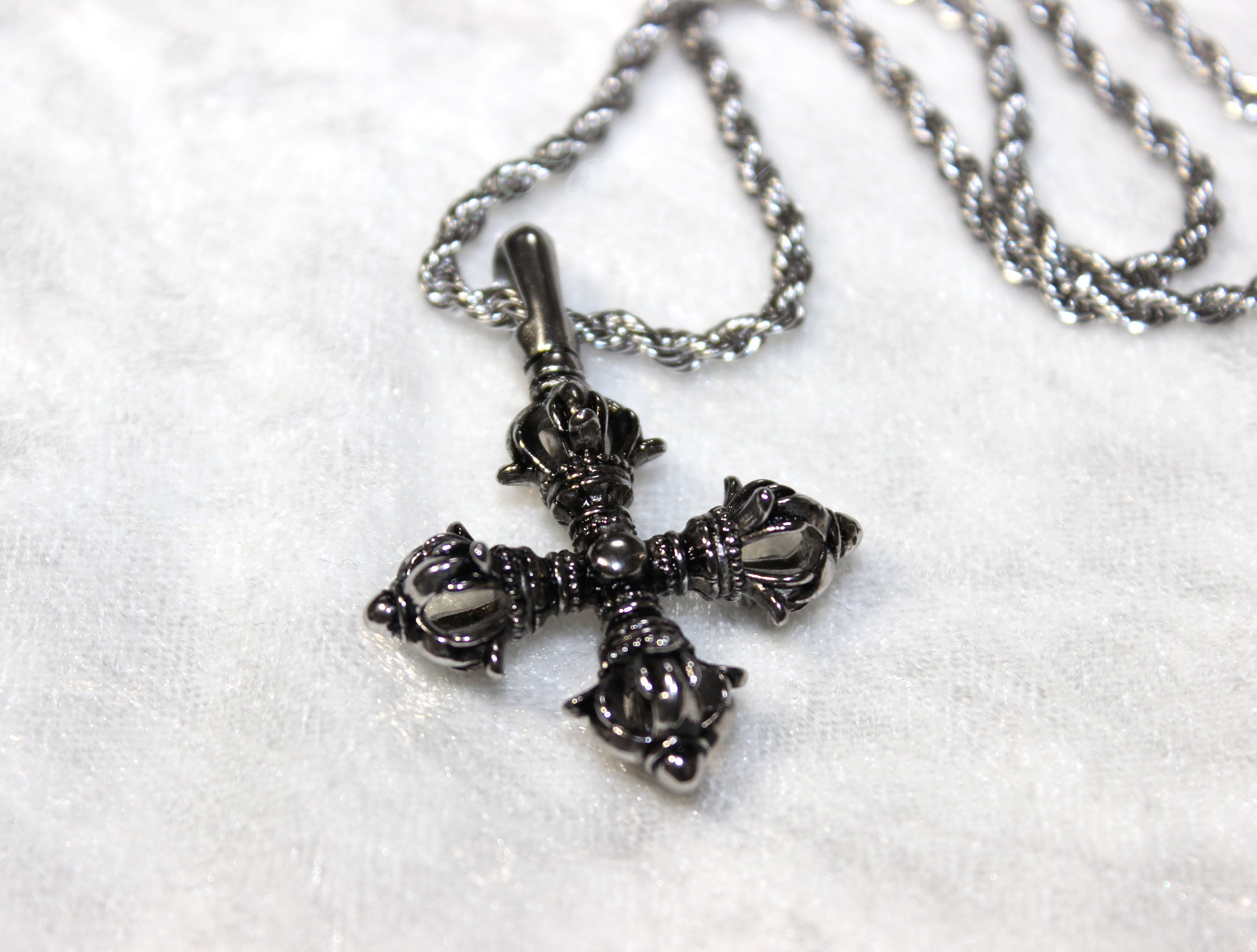 十字の形をした金剛杵です。チェーンは麻縄タイプで60cmです。チェーンもペンダントトップも、材質は金属アレルギーの方に優しいサージカルステンレス(医療用合金)です。