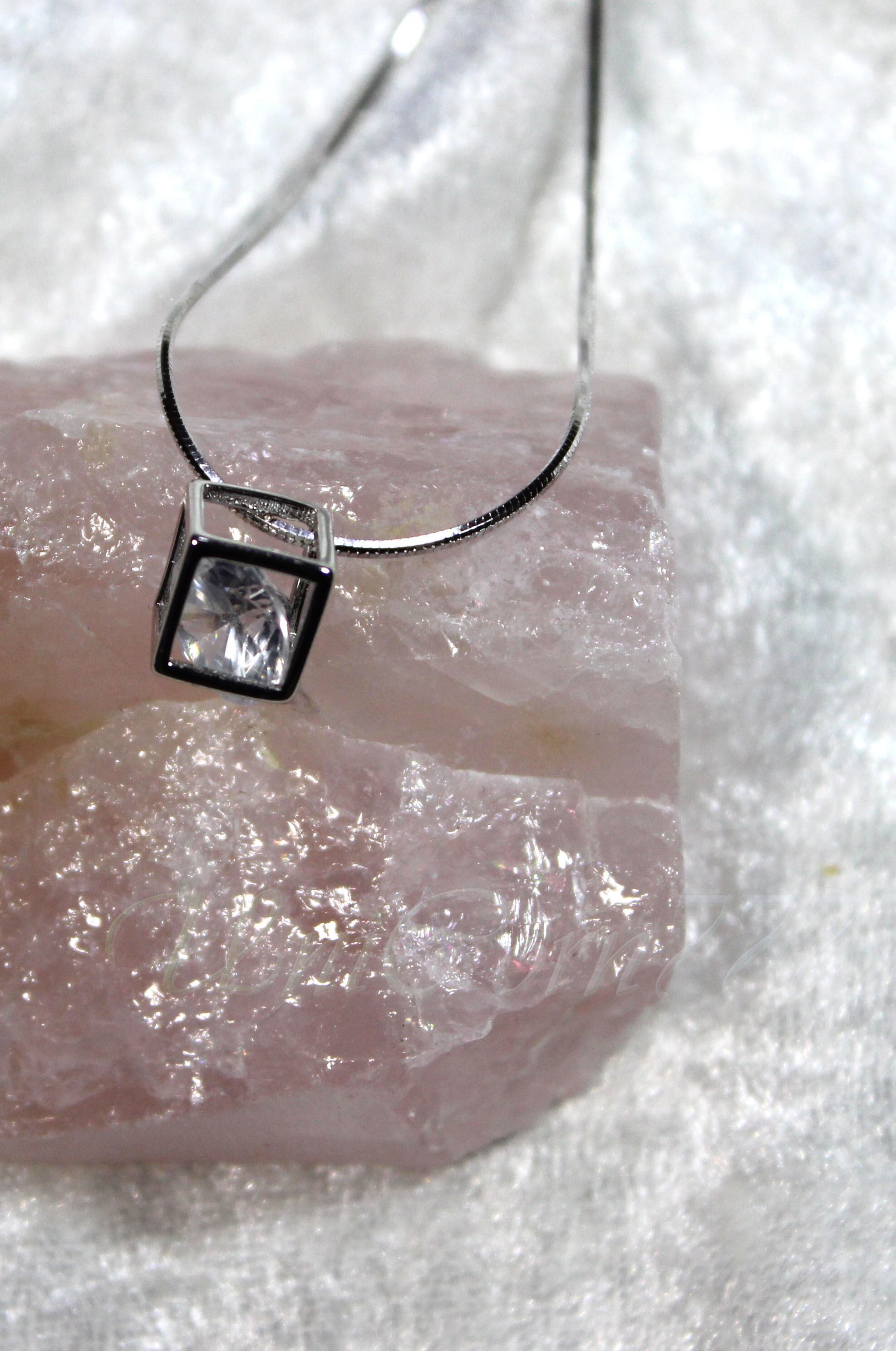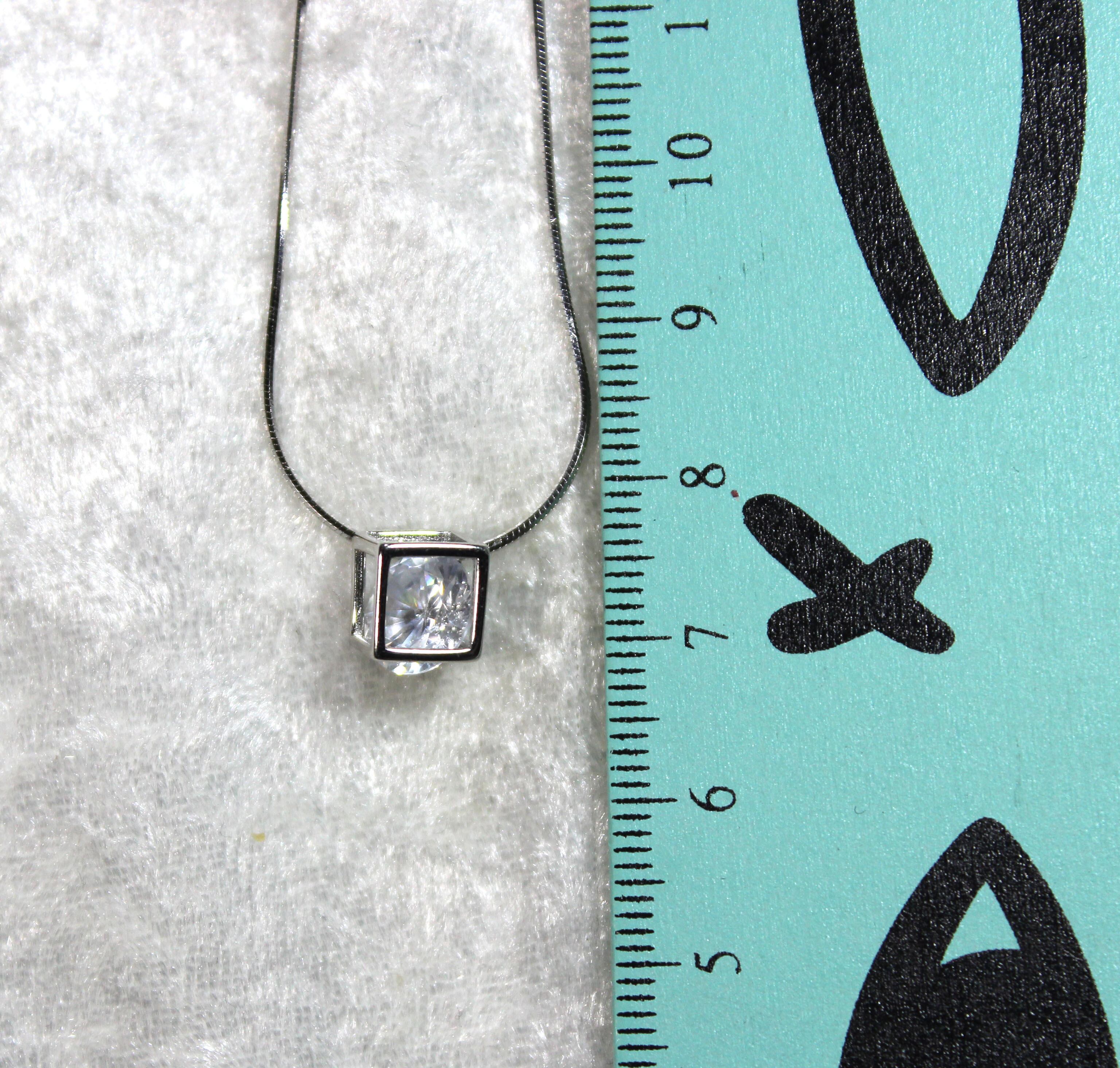 キューブタイプ(立方体型)のネックレスです。このネックレスは、S925銀製品(スターリングシルバー)です。トップは、8mm×8mmで重量は1.2gです。チェーンはティラ(スネイク)タイプで、45cmです。