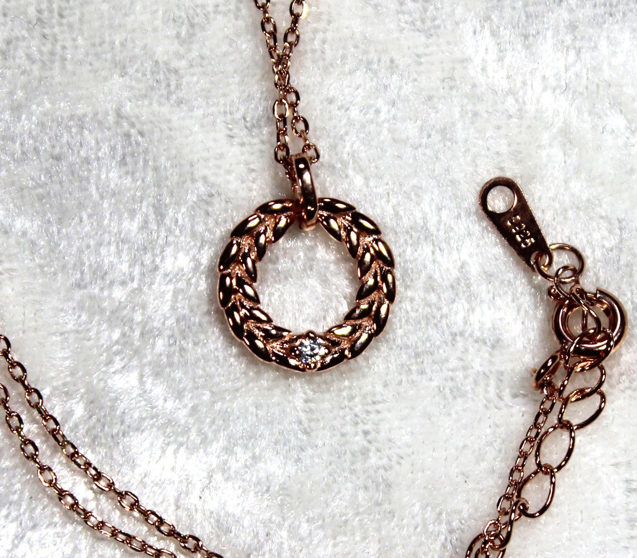 オリーブ冠、もしくはオリーブのリースの形をしたネックレスです。材質はS925銀製、スターリングシルバーになります。チェーンは、40cm+アジャスター5cm=45cmです。