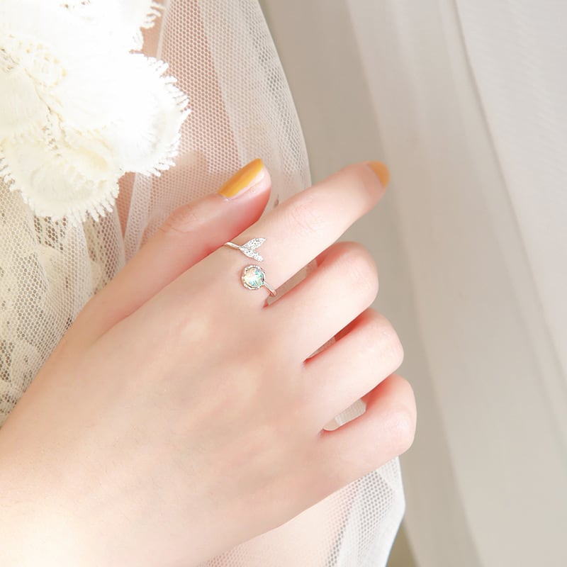 この指輪は、S925銀製品、スターリングシルバーの月光石を使用した指輪です。反対側の先端が人魚の尾ひれになってます。サイズフリーのオープンリングですが、デフォルトの大きさは15号程度です。