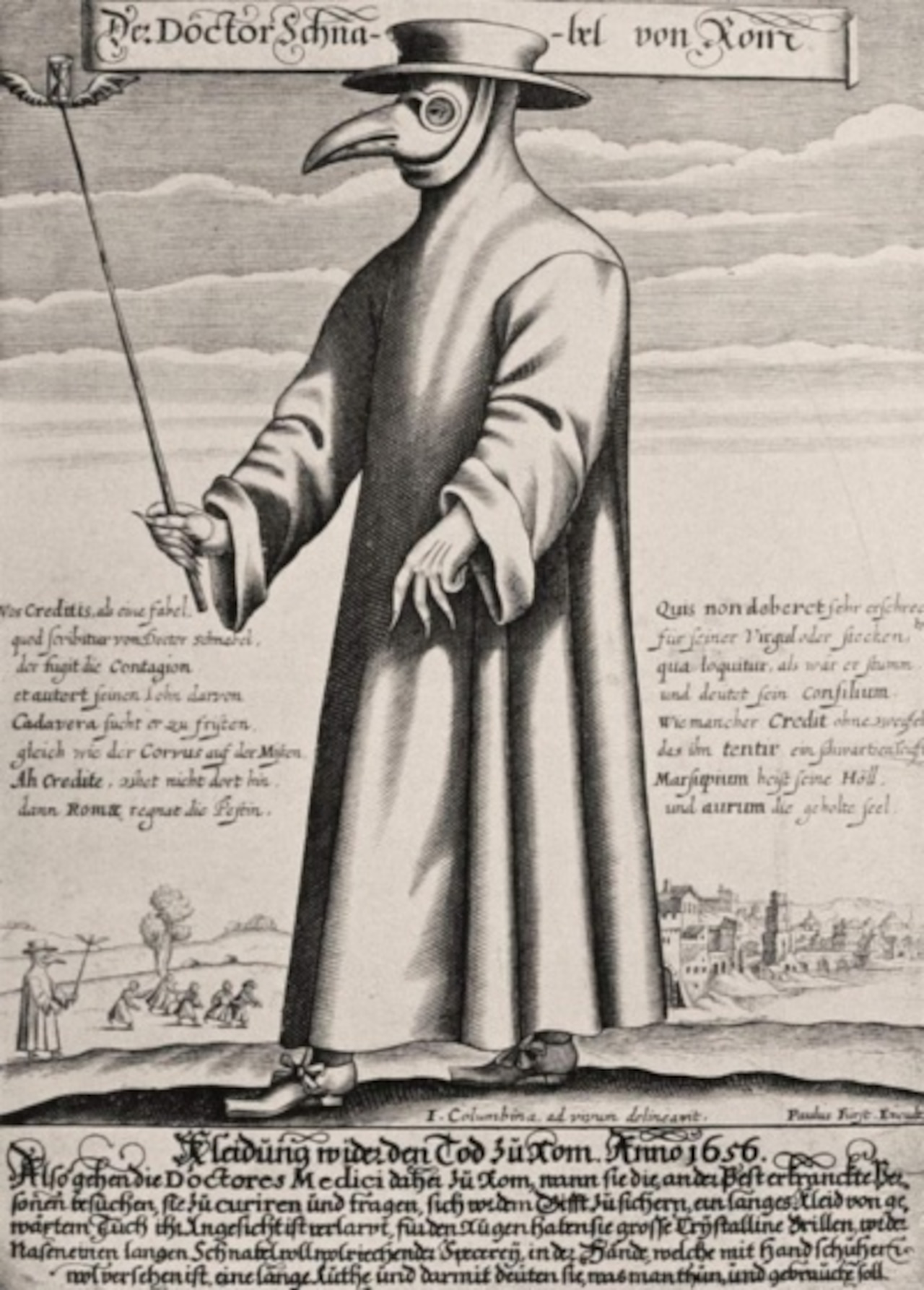 なぜ、鳥のクチバシのような形状をしているかと言うと、当時の医師は悪臭が菌を運ぶと信じていたため(これを「瘴気理論」と言う)、このクチバシの中に強い香りを放つアンバーグリス(龍涎香)やミント、バラの花ビラなどを詰めて、強い香りによって病気を遠ざけようとしたからです。