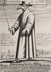 このマスクは、1619年にフランスの医師シャルル・ド・ロルメによって、ペスト医師用の感染防護服、プレイグドクターコスチュームとして開発されました。マスクだけではなく、当時の医師は、ヤギ革製の帽子や手袋、患者を触る(直接の接触を避ける)ための杖、香料入りのワックスを塗ったコート、ブーツとつながる丈が短めのズボンなどを身に着け、ペスト患者の治療にあたりました。