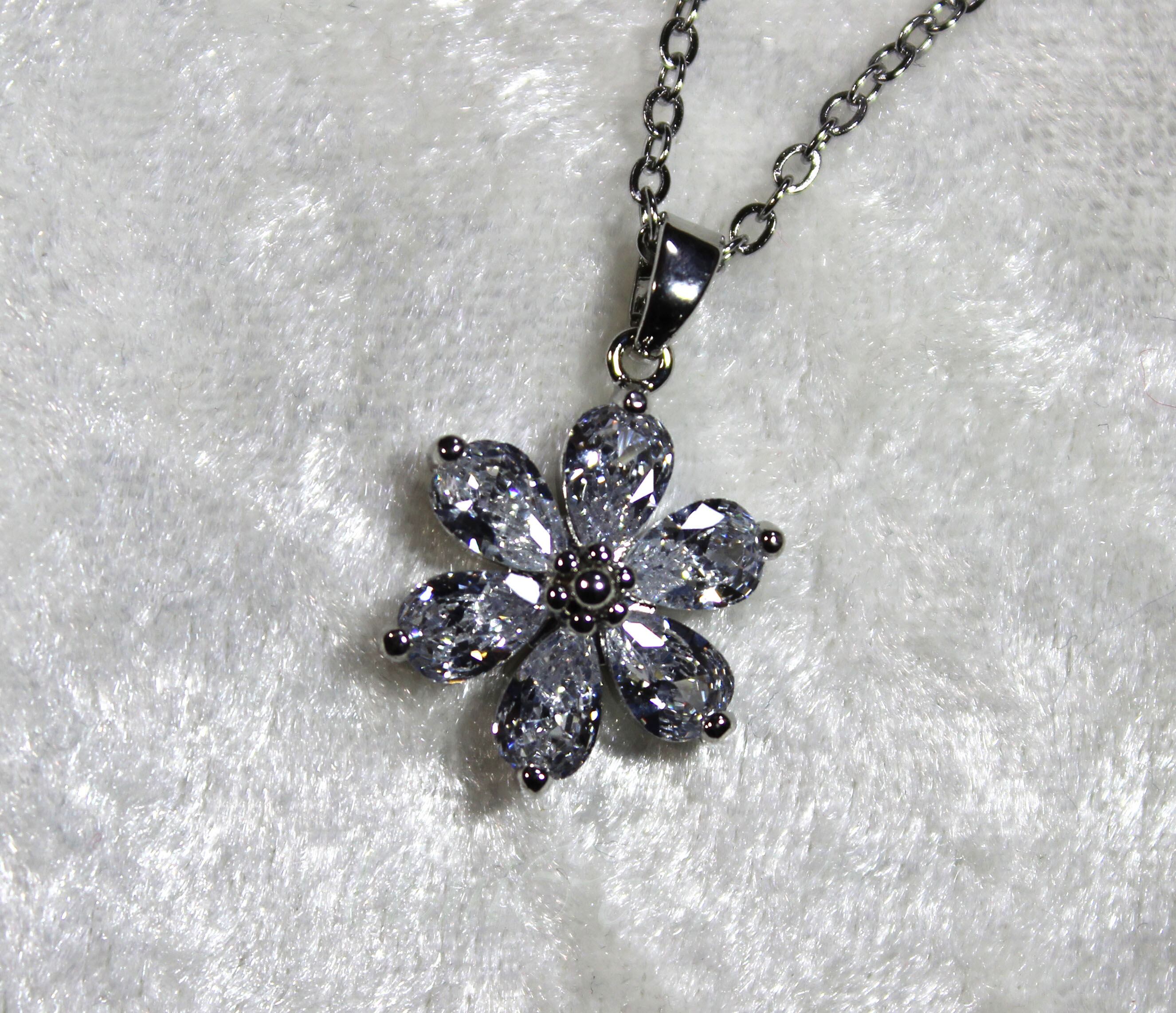 花びら6枚のフラワーを象ったネックレスです。チェーンは、サージカルステンレスなので、金属アレルギーの方の肌に優しいと思います。40cm+アジャスター5cm=45cmです。