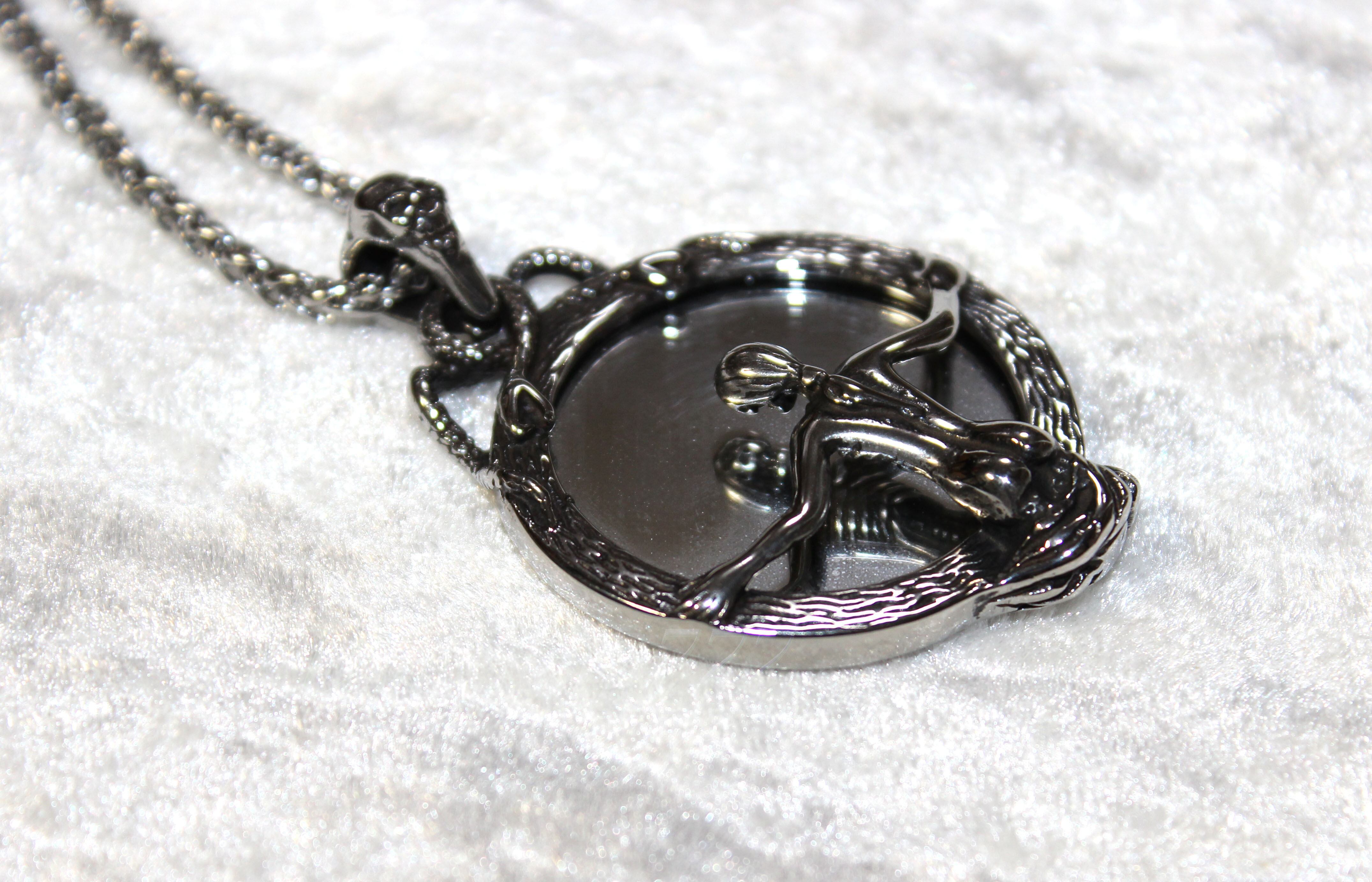 魔鏡に心を取り込まれてしまった女性をデザインしたペンダント・ネックレスです。チェーンの長さは頭からすっぽりかぶれる80cmですが、長すぎる方は、60cmに交換可能です。