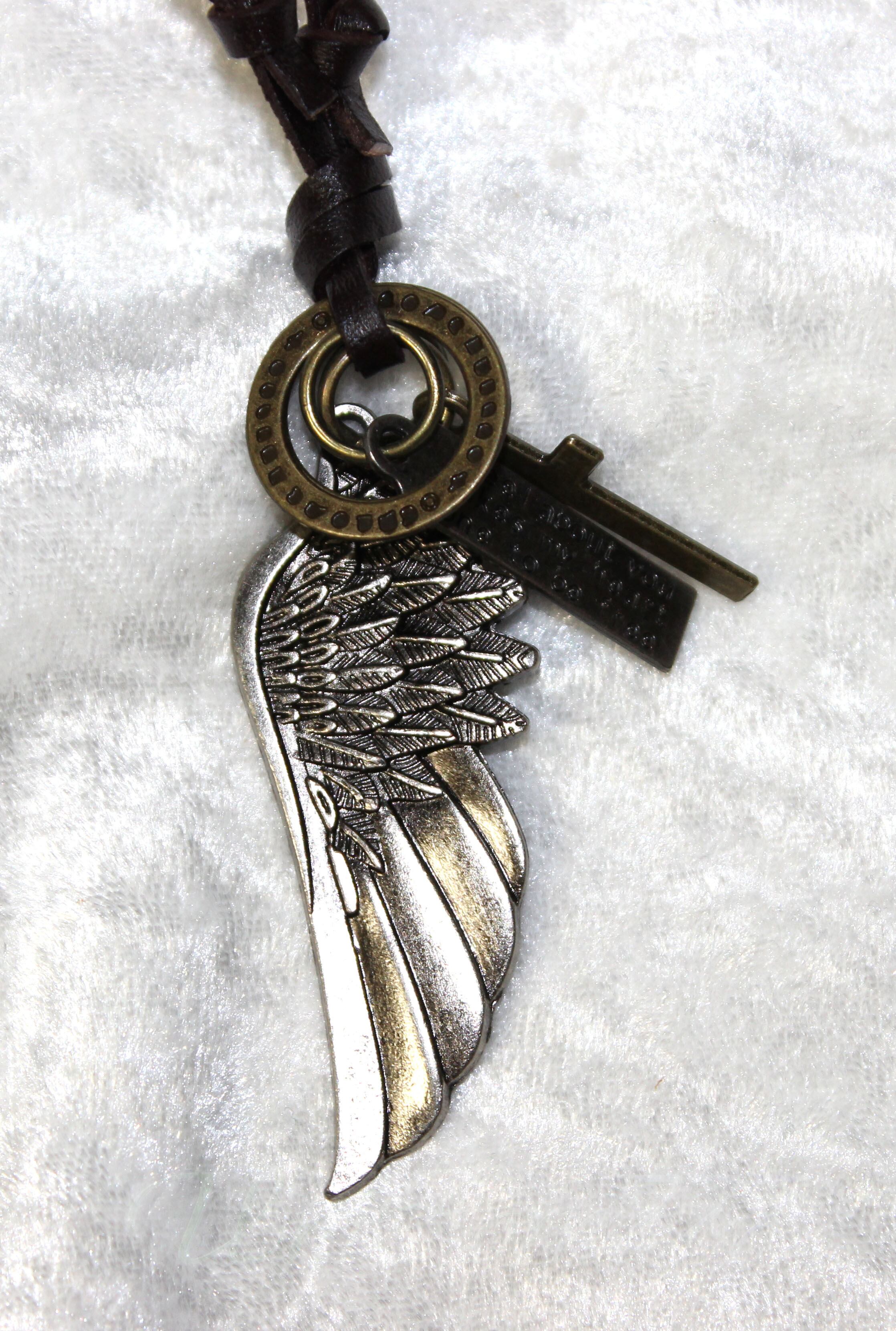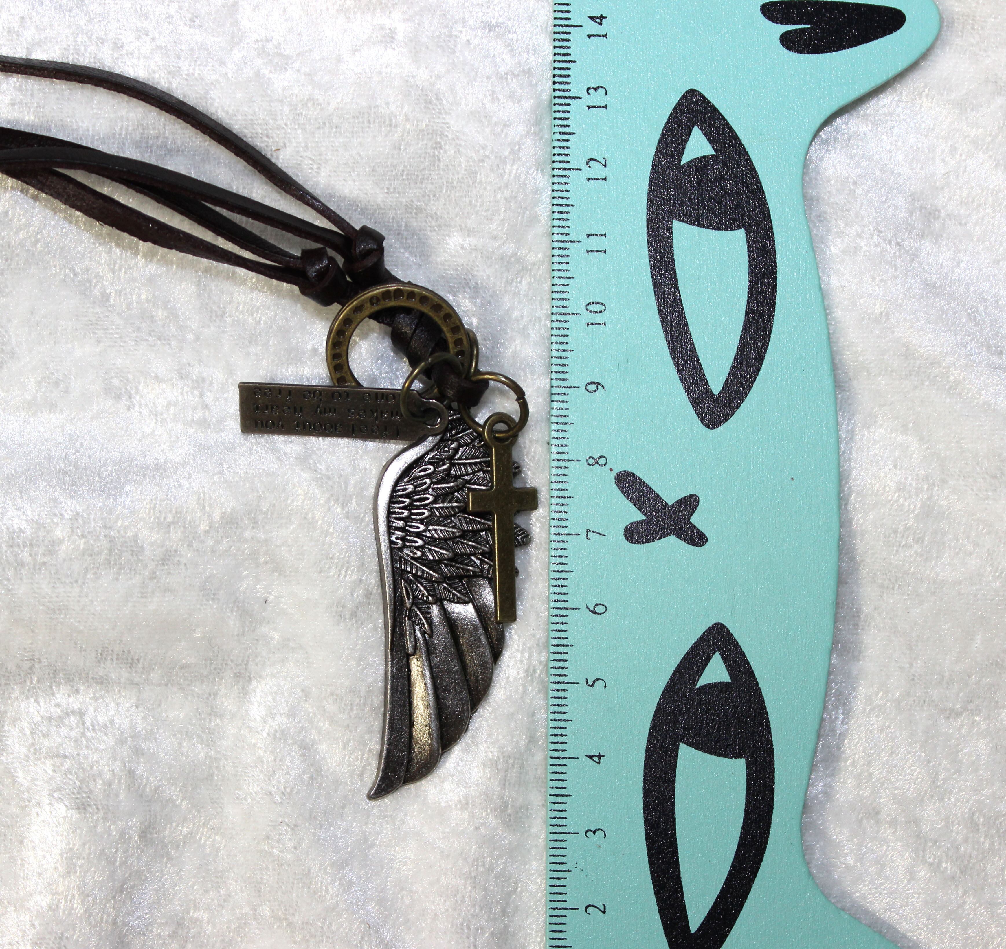 天使の羽根とクロスをマッチングしたネックレスです。チェーンは本革で幅0.3CM、長さ68-75CMで長さを調整できるようになってます。