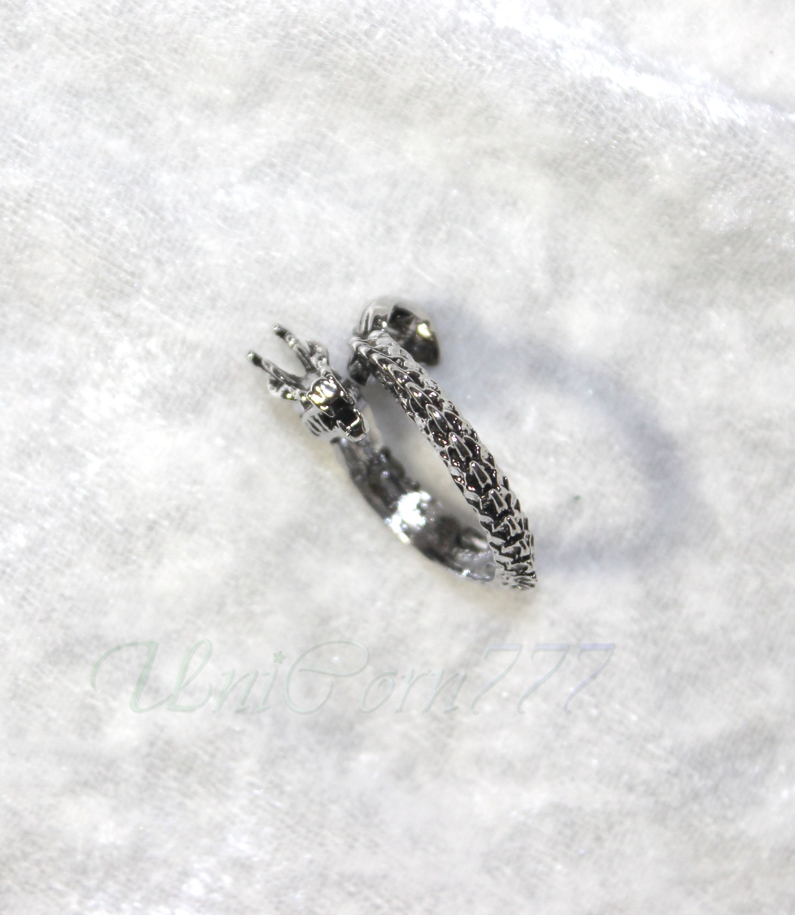 ドラゴンをモチーフにした指輪です。大きさは、オープンリングなのでサイズフリーですが、デフォルトの大きさは14号程度です。