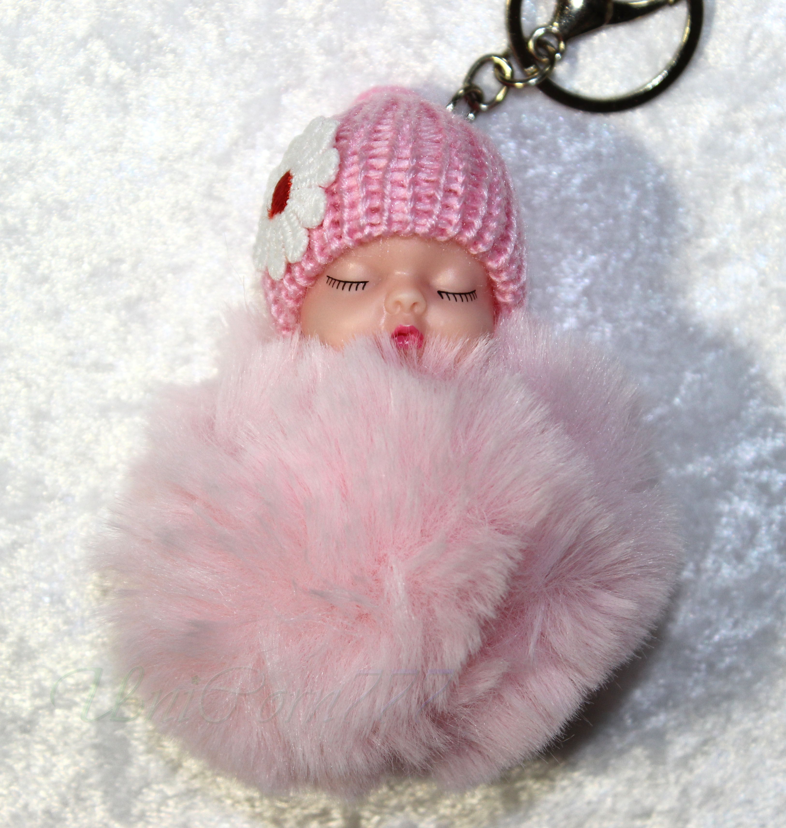 手のひらサイズの可愛い赤ちゃん、ふわふわボンボンのキーホルダーです。