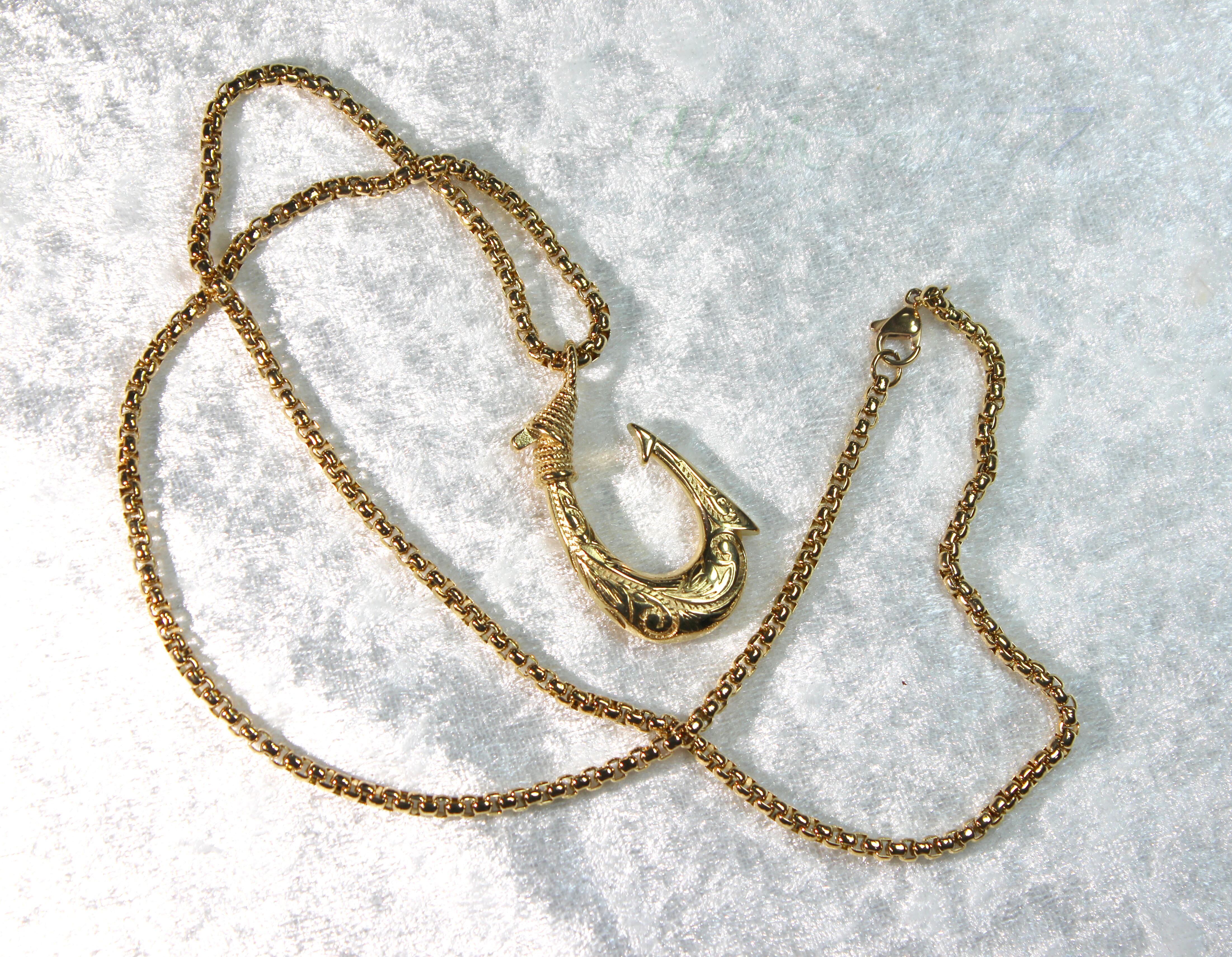 釣り針には返しが有り、一度刺さると抜けないことから、幸運を逃さない、あるいは、幸運を引き寄せる(釣り上げる)という意味合いが込められています。また、胸にかけた釣り針の先端を、自分の心臓の位置へ向けておくと、命をつなぎ止めてくれると信じられていて、ハワイで漁をする人が海で遭難した時のために身に着けたそうです。