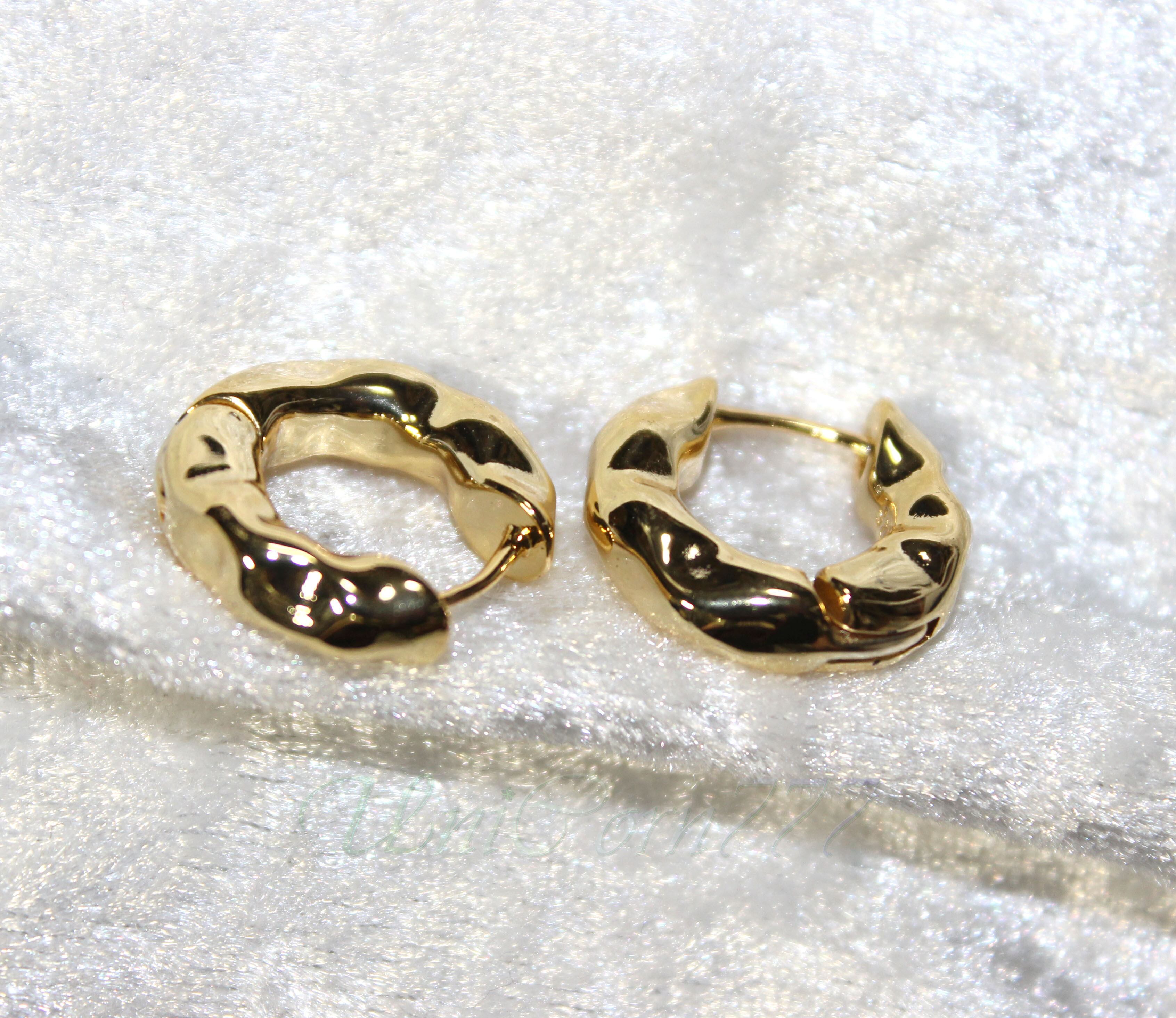 このフープピアスは、まるで溶けたマグマが冷えて固まったような独特なデザインが特徴です。どんなコーディネートにも一味違った個性をプラスしてくれること間違いなし!洗練されたスタイルや、カジュアルな装いにもピッタリのアイテムです。